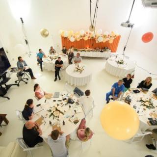 Looking for the perfect place to host your next event, video production or meeting in Baton Rouge? Our all-white 34' x 32' (1100 sq ft) studio with natural light is lit with a large 12'x14' glass roll-up door. The space is as bright or dark as you need it based on curtains we installed over the door. The minimalist yet modern decor of this space allows for your creative genius to transform the studio into your dream. We host regular networking meetings as well as video shoots when a client wants to have an all-white theme.